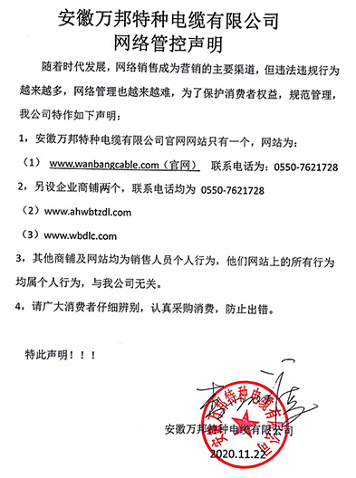 鄭重聲明:安徽萬邦特種電纜有限公司官方網站為:www_wanbangcable_com.jintou888.com,除此之外無任何子網站或合作網站,其余均為假冒偽劣。電話:0550-7621728 13485756353 地 址:安徽省天長市滁州高新技術產業開發區經四路29號